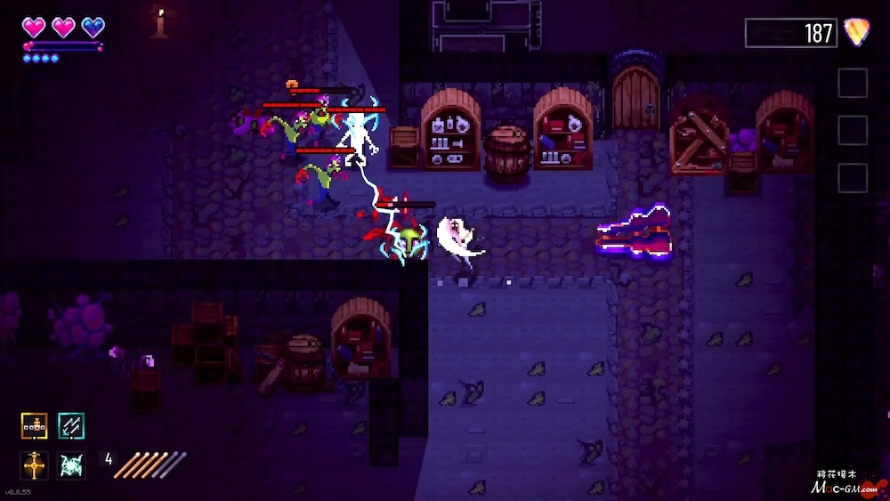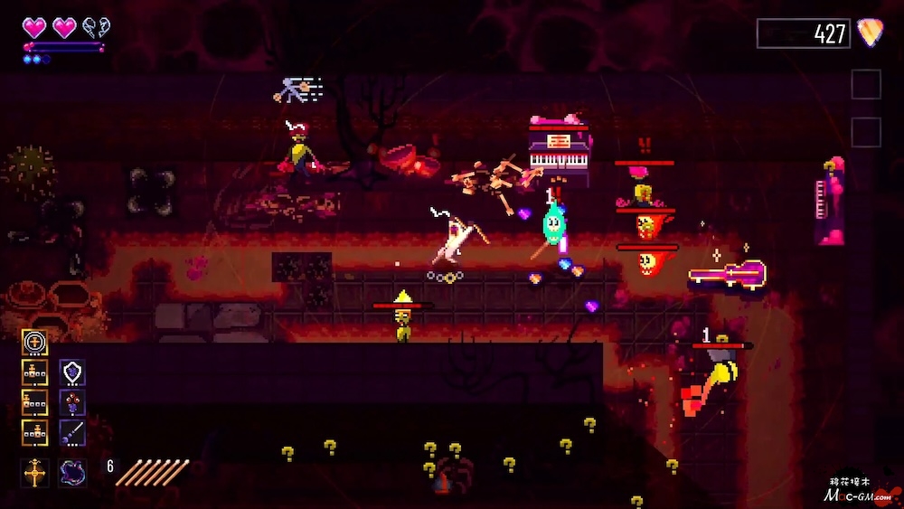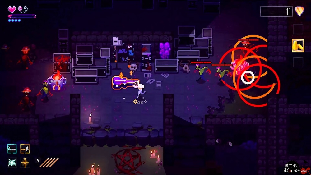 这些力量会为你的鼓棒上加上附魔,污油还是烈火?雷电或是圣光?当你确定选择后,会立刻面临一次由敌人组成的金属狂潮,突破他们的封锁即可逃进下个区域。这个循环最令人振奋的是,多种唱片力量之间的配合超乎想象!