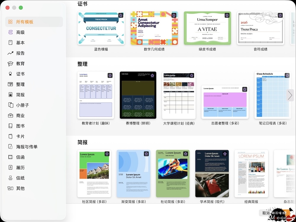 超过 70 种 Apple 设计的模板可以选择,即时创建精美的报告、电子书、履历、卡片和海报等内容