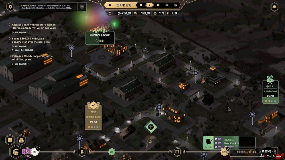 你是制片厂的老大,而《好莱坞动物》为你备好了与这一身份相符的各类挑战。你的时间非常宝贵,所以别把精力浪费在挑选墙纸或打理花坛上。你要思考的是用什么样的角色和主题才能抓住观众,该投资哪些有可能在行业掀起巨浪的新技术。对了,你还得屈尊去和那个年轻巨星聊聊,说服他签长期合同——虽说这个心高气傲的混球曾赌咒发誓过再不同你合作。