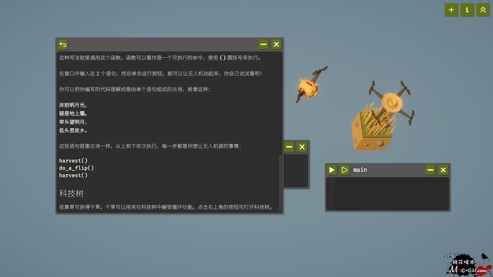 使用简洁的类 Python 语言为无人机编程,将枯燥磨人的各式农活彻底自动化。只需轻点“执行”按钮,即可欣赏无人机包揽所有繁重劳动,感受自动化带来的满足与享受。