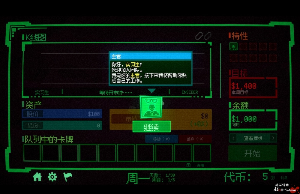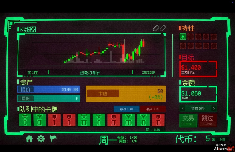 这并不是一款股市交易模拟游戏。这是一个由你的选择构成的牌组构建游戏。在休市期间,你可以前往盘后交易市场并在不同卡池中抽取手牌,但要小心,收益往往与风险并存。有些卡牌能够让牌组变得更强。有些则恰恰相反。开市之后,你只能够依赖精心构建的牌组来左右股价走势。