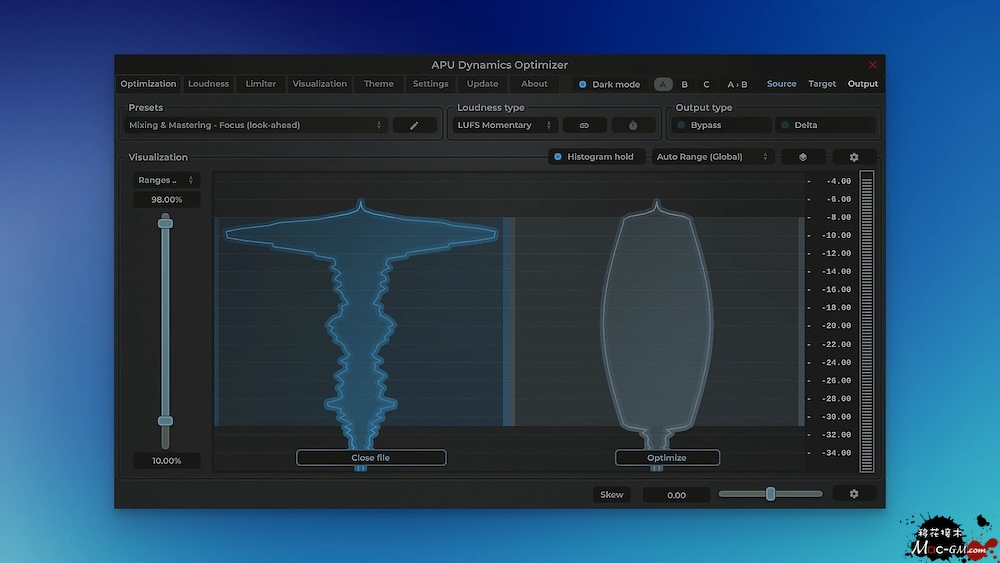 动态优化器允许您重塑音频文件的完整动态频谱。您可以选择“均匀”或“正态”分布,并可以将后者偏向分布的顶部或底部。这允许您以多种方式塑造音频的动态。优化器会获取此信息并使用它随着时间的推移对压缩/扩展比率进行许多微小的调整。这是您使用传统压缩器永远无法做到的事情。
