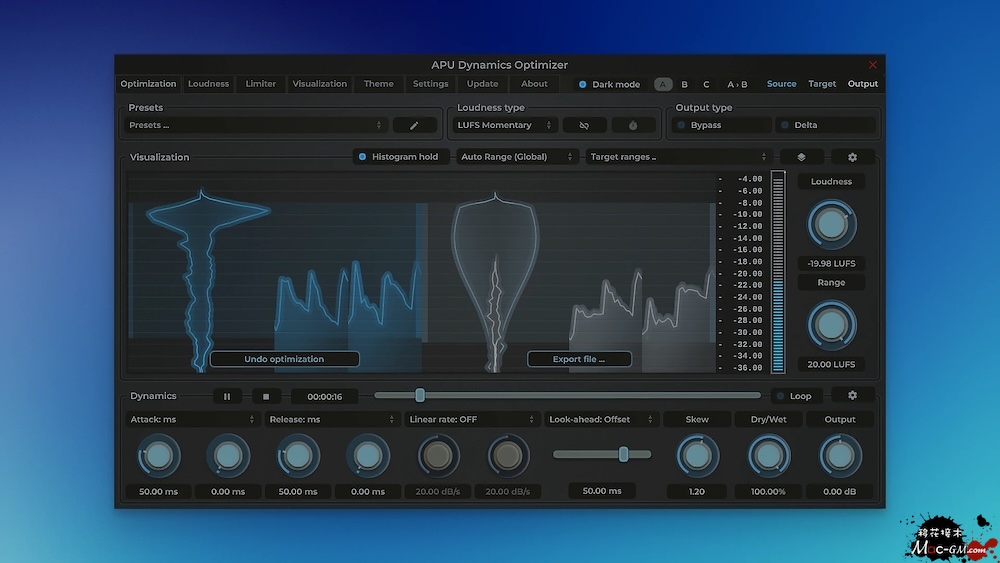 此工具的设计可让您非常精确地定位特定的平均 LUFS 和动态范围。优化增益包络后,您可以实时播放结果,同时使用压缩器插件中的相同参数集合调整声音的特性。