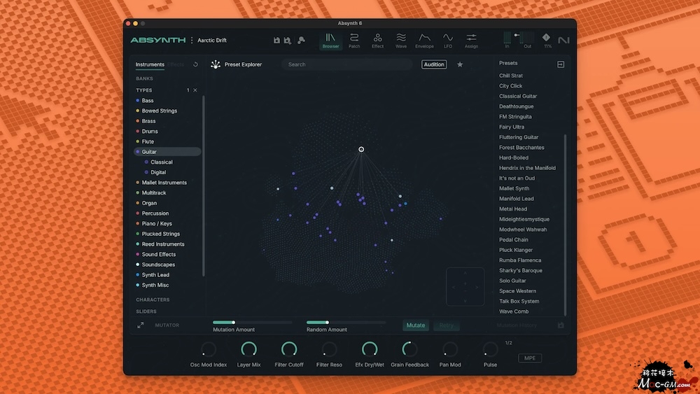 变异预设 借助变异器,灵感触手可及。使用它将不同的预设变形为全新的预设,瞬间生成新的变体。将它们雕琢成你喜爱的声音——同时保留更改时间线,以便快速回顾和完善你最喜欢的音色。