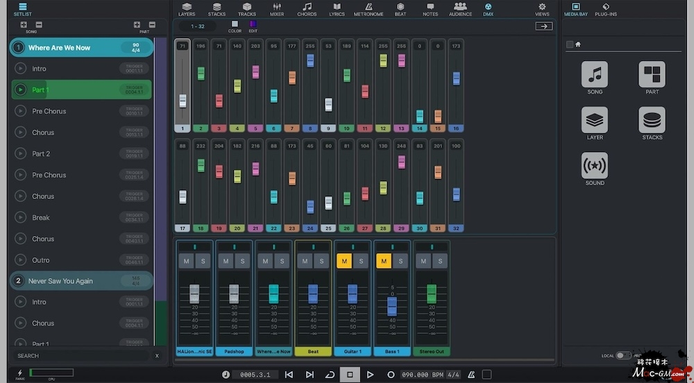 使用终极现场表演系统 VST Live 让您的生活更轻松。它是一款独特、稳定的软件解决方案,专为想要在任何地方上演精彩演出(包括声音、灯光和视频)的音乐家而设计。VST Live 带有大量虚拟乐器、音乐同步功能、在其他设备上显示的文本和和弦符号、视频、Cubase 导入、用于直接 DMX 灯光控制的 MIDI 轨道等等。