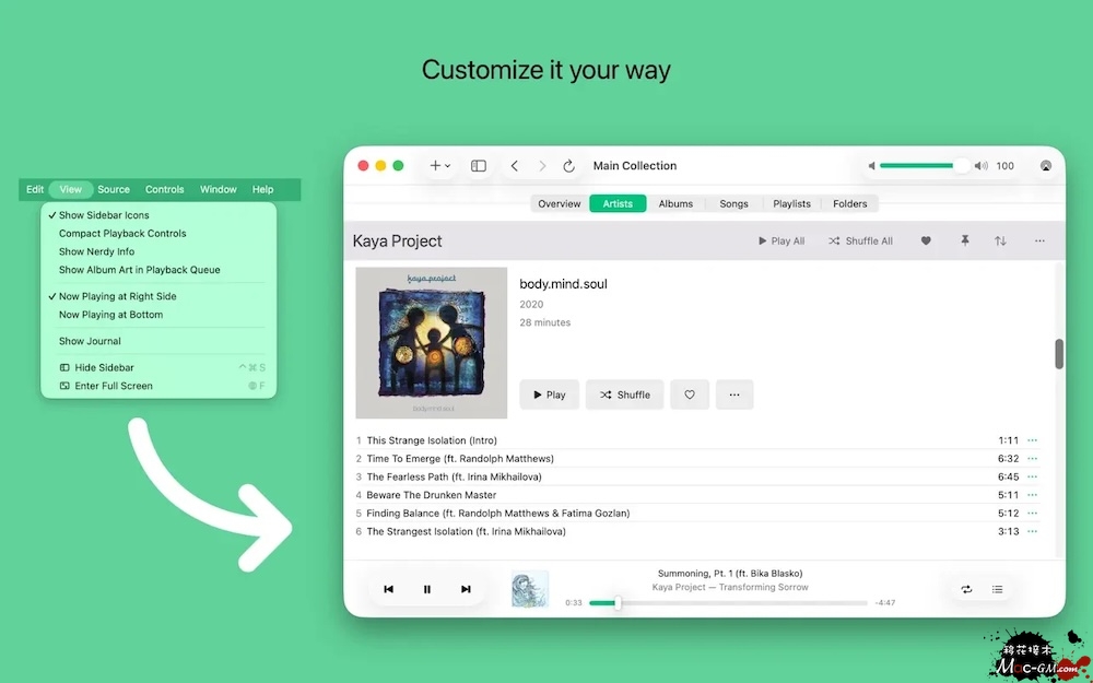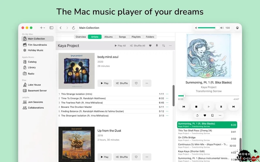 全平台音源聚合 无缝接入:Mac 本地音乐、Apple Music、Plex 媒体服务器、Jellyfin 媒体服务器 统一歌单与播放队列,跨源无缝切换,无需切换多个 App 智能个性化聆听 自动跳过(Auto Skip):标记不喜欢的歌曲,播放时自动过滤,避免重复打扰 音乐日记(Journal):替代传统星级评分,可记录听歌感受、场景、心情,沉淀音乐感悟 收藏(Favorites):快速筛选最爱曲目,一键进入专属歌单 高效播放管理 固定置顶(Pins):常用歌单 / 专辑固定列表顶部,一键直达 可撤销随机(Undoable Shuffle):打乱后可撤回,保留原有播放顺序 队列保存(Save Queue as Playlist):当前播放队列直接存为新歌单 AirPlay 投屏:支持无线推送至音箱 / Apple TV