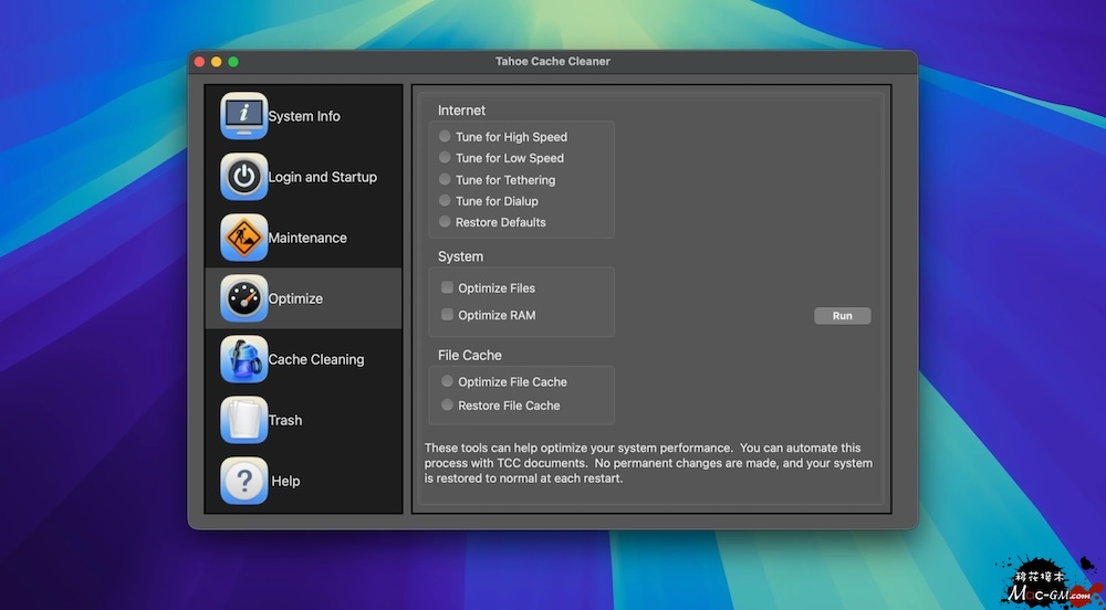 Tahoe Cache Cleaner 可以通过调整网络和文件缓存设置、启用 RAM 磁盘以及清理各种缓存和过期数据来提升系统性能。TCC 还包含用于优化文件和内存的工具。 TCC 可以通过删除语言本地化文件和精简通用二进制文件来回收浪费的磁盘空间。