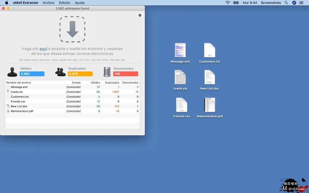 只需将文件或文件夹拖到应用程序窗口(或图标),电子邮件提取器将扫描其内容,找到所有有效的电子邮件地址,并将其保存在空白列表中——准备在时事通讯中使用或导入到CRM中。
