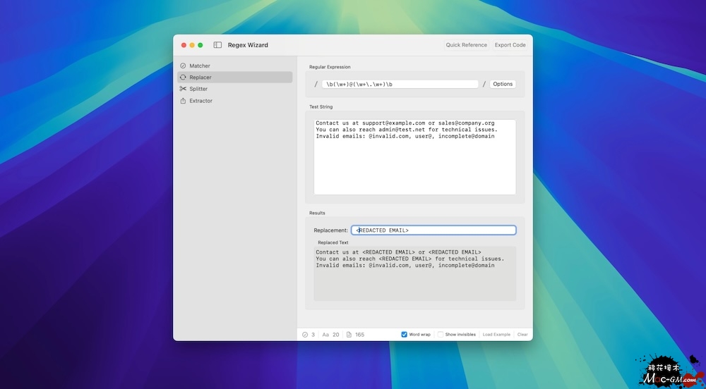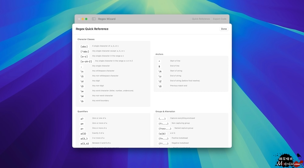 RegEx Wizard for mac一款正则表达式生成器,可以创建、测试并掌握正则表达式模式,并进行实时验证和即时反馈。