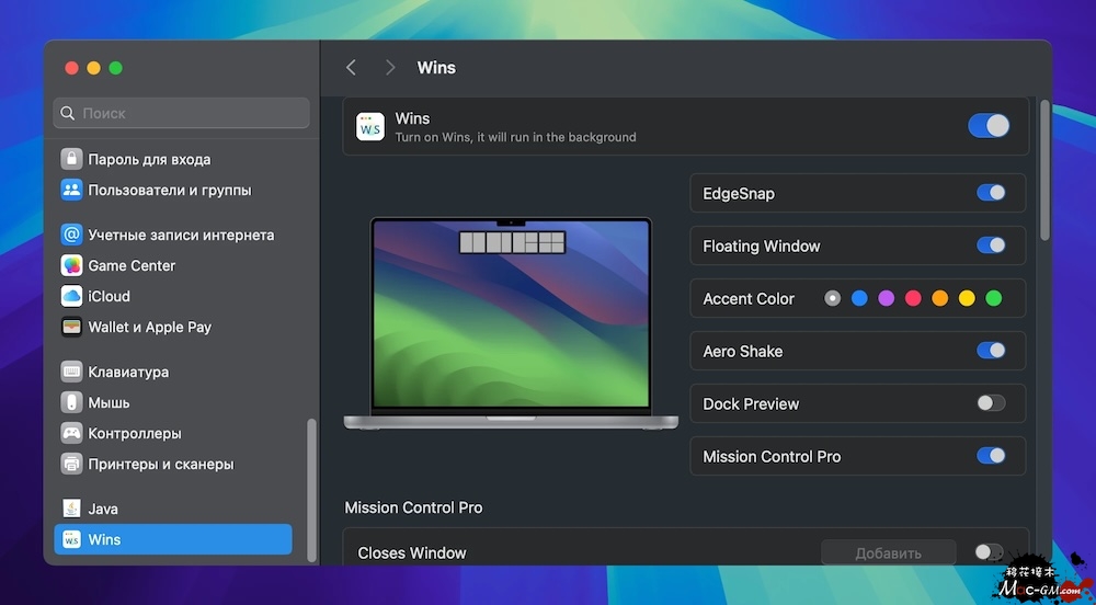 Wins没有独立窗口,不占用Menu Bar、不占用Dock栏,设置面板集成在系统偏好设置中,提供更加纯净的用户体验。
