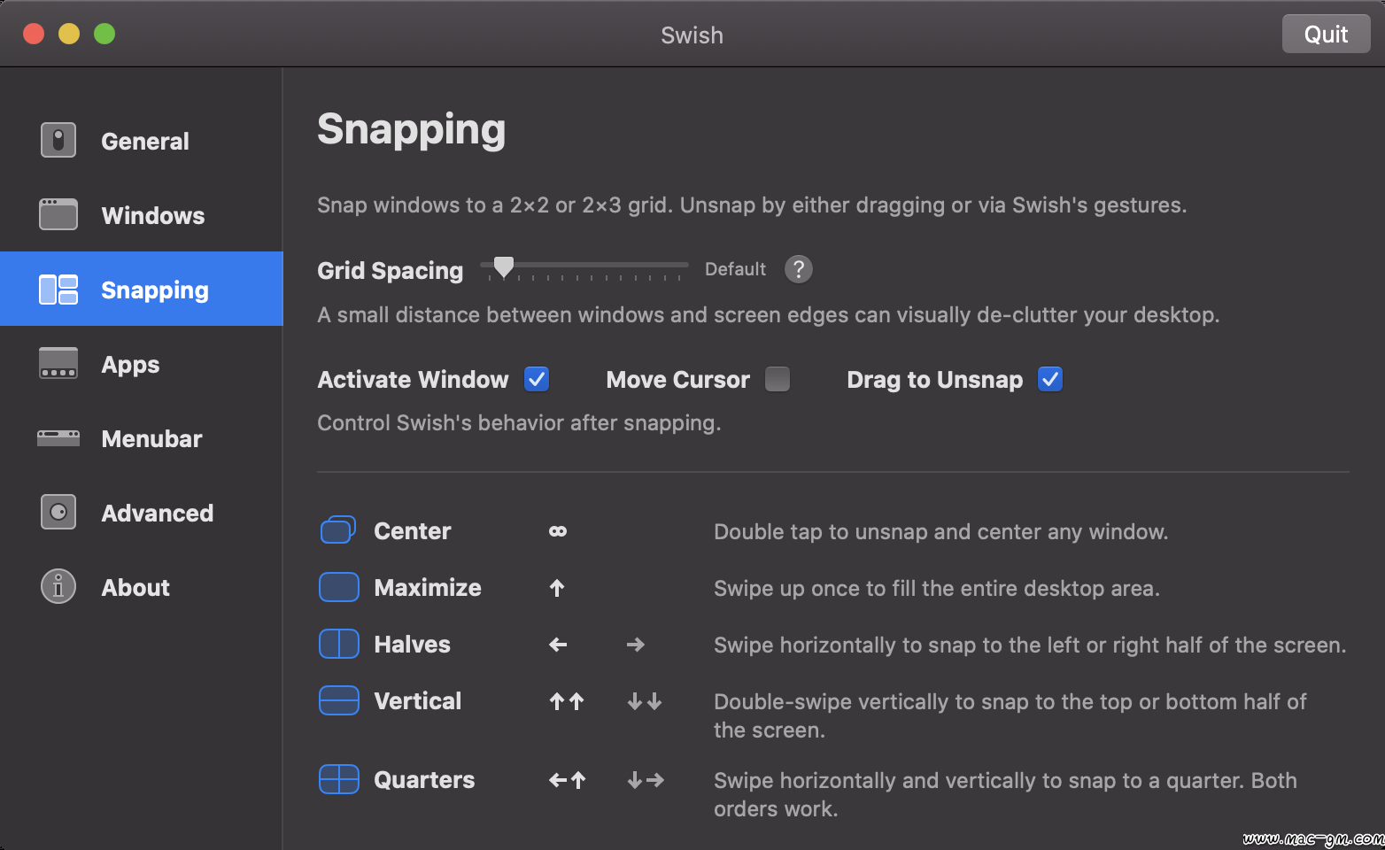 您的桌面看上去从未如此干净。 Swish是唯一真正尊重macOS外观的窗口管理器。网格甚至会对黑暗模式以及您的扩展坞设置做出反应。