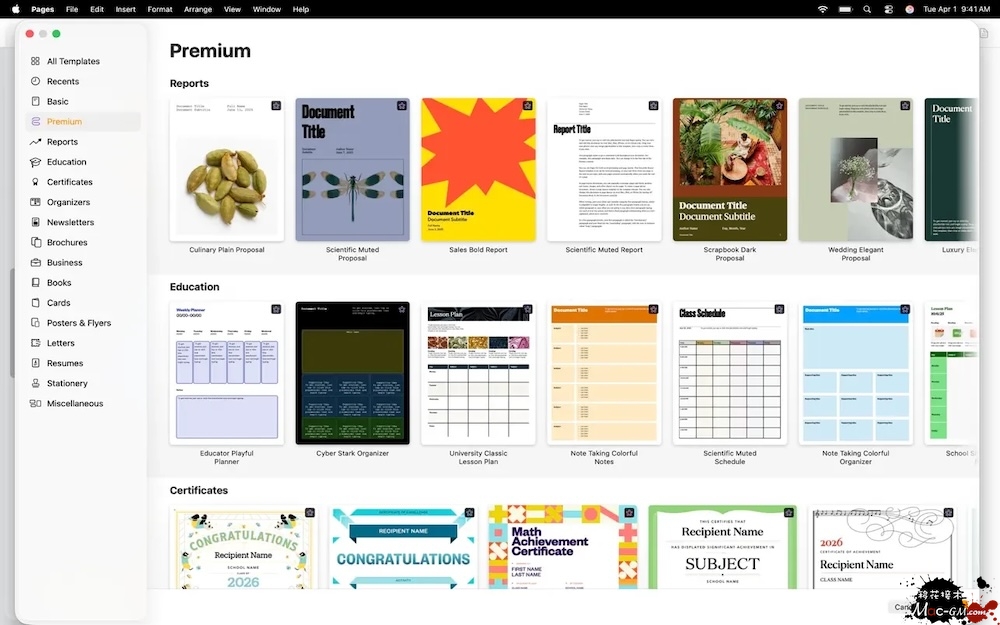超过 70 种 Apple 设计的模板可以选择,即时创建精美的报告、电子书、履历、卡片和海报等内容