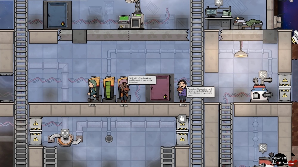 坠毁的飞船可以提供庇护并能让你的船员生存一段时间。但为了生存,你必须建设一个适合的基地并组建一个能够面对任何危险的灵活社区。你的船员需要一个可以睡觉、进食、洗漱、治疗和闲逛的地方以保持士气。管理温度、连接、管道——这仅仅是个开始。复杂性会随着时间的推移而提高。最终,你必须实现基地自动化,因为基地在发展,您的任务清单也在发展,但你的团队规模却不会发展。