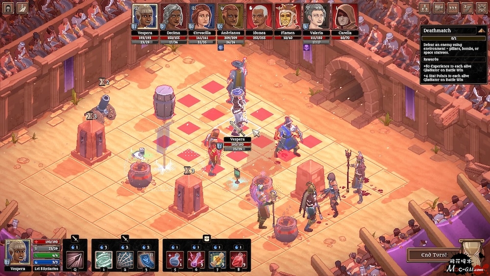 在回合制竞技场战斗中,引领你的角斗士队伍奋勇杀敌。你需要招募新兵、勤加训练、甚至必要时为荣光牺牲战士。但请记住,角斗士终究是肉体凡胎,如果倒在战场上,就永远离去了……不过他们的事迹会继续流传。