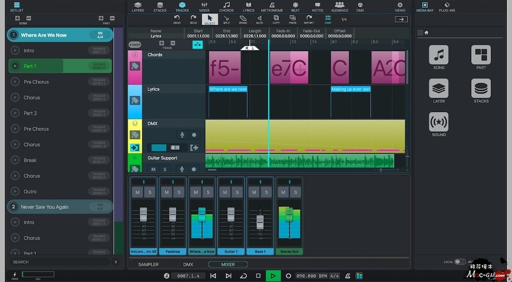 VST Live 具有让您的歌曲为舞台做好准备所需的所有功能。对于您的声音,它包括大量虚拟乐器和集成音序器,具有同步功能以保持每个节拍和小节的时间紧密。您还可以在其他设备上显示歌曲文本和和弦符号,因此每个人都可以真正地“从同一张表上唱歌”。当然,您的灯光和视频需要与音乐紧密结合,因此 VST Live 允许灯光同步并提供您需要的尽可能多的视频轨道,确保一切都在应有的准确时刻发生。