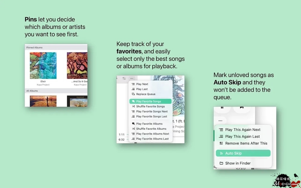 全平台音源聚合 无缝接入:Mac 本地音乐、Apple Music、Plex 媒体服务器、Jellyfin 媒体服务器 统一歌单与播放队列,跨源无缝切换,无需切换多个 App 智能个性化聆听 自动跳过(Auto Skip):标记不喜欢的歌曲,播放时自动过滤,避免重复打扰 音乐日记(Journal):替代传统星级评分,可记录听歌感受、场景、心情,沉淀音乐感悟 收藏(Favorites):快速筛选最爱曲目,一键进入专属歌单 高效播放管理 固定置顶(Pins):常用歌单 / 专辑固定列表顶部,一键直达 可撤销随机(Undoable Shuffle):打乱后可撤回,保留原有播放顺序 队列保存(Save Queue as Playlist):当前播放队列直接存为新歌单 AirPlay 投屏:支持无线推送至音箱 / Apple TV