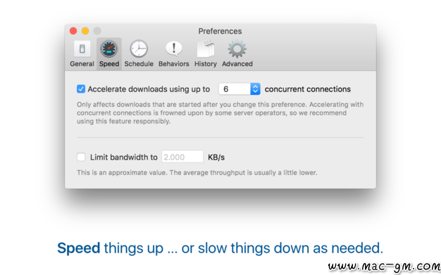 它具有您在下载管理器中所期望的一切 - 加速,带宽限制,调度,规则,下载历史等等。