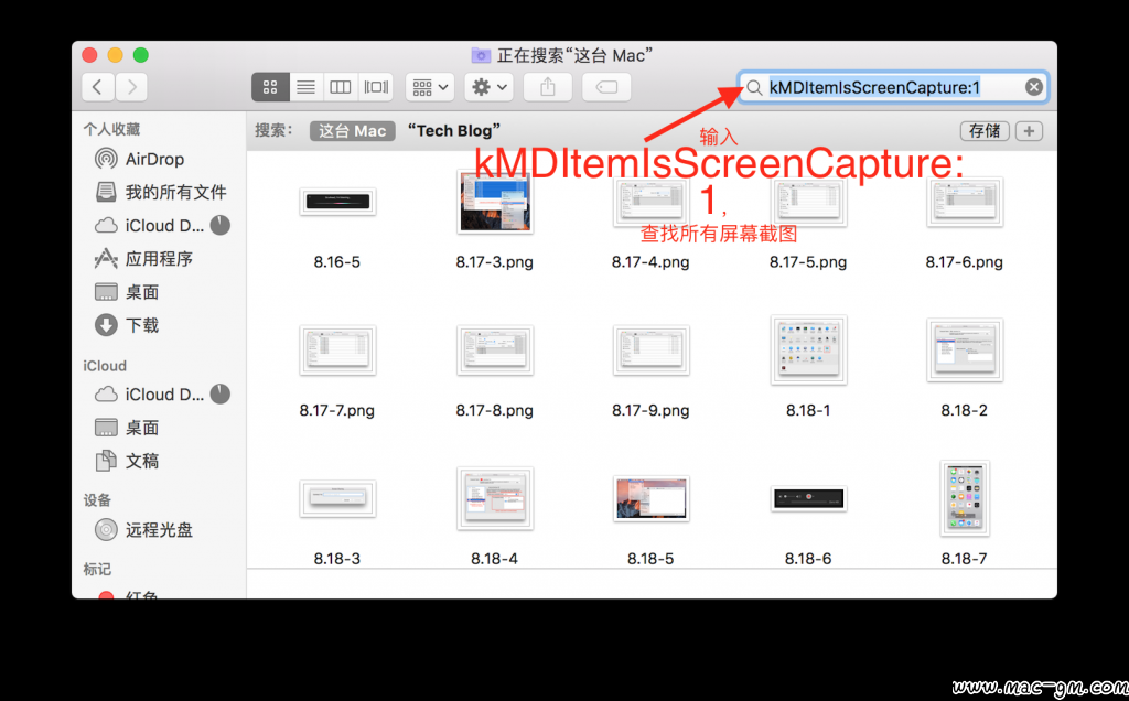 - 按下 Command + Space,打开 Spotlight,输入 kMDItemIsScreenCapture:1;