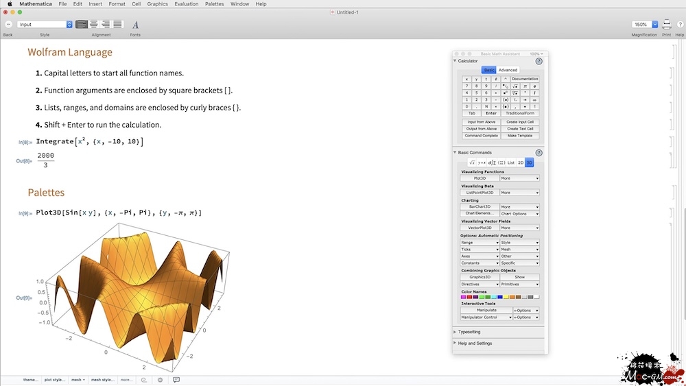 文件和代码:Mathematica使用Wolfram笔记本界面,它允许您组织在富文档中执行的所有操作,包括文本,可运行代码,动态图形,用户界面等。
