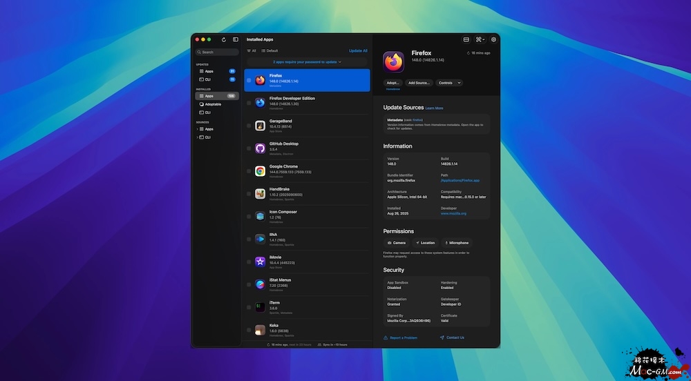 全渠道统一管理 一站式检测与更新来自 Homebrew、Mac App Store、Sparkle、Electron、GitHub Releases 的所有应用,覆盖绝大多数 macOS 软件生态。 一键批量 / 选择性更新 支持全选批量更新、单独勾选更新,或跳过指定版本、忽略特定应用,灵活掌控更新节奏。 Homebrew 可视化增强 图形化界面简化 Homebrew --adopt 等复杂命令,轻松将已装应用纳入 Brew 统一管理。 深度安全与信息透明 显示代码签名、公证状态、Gatekeeper 校验、下载地址、版本号、安装包大小等完整信息,更新更放心。 本地优先・隐私至上 全程本地处理、零追踪、无分析、不上传数据,仅在检查更新时最小化联网。 原生设计 + 菜单栏快捷入口 清爽 macOS 原生 UI,支持菜单栏常驻,快速查看更新状态。 自动扫描 + 版本对比 自动扫描已装应用,清晰展示当前版与最新版,支持历史版本对比。